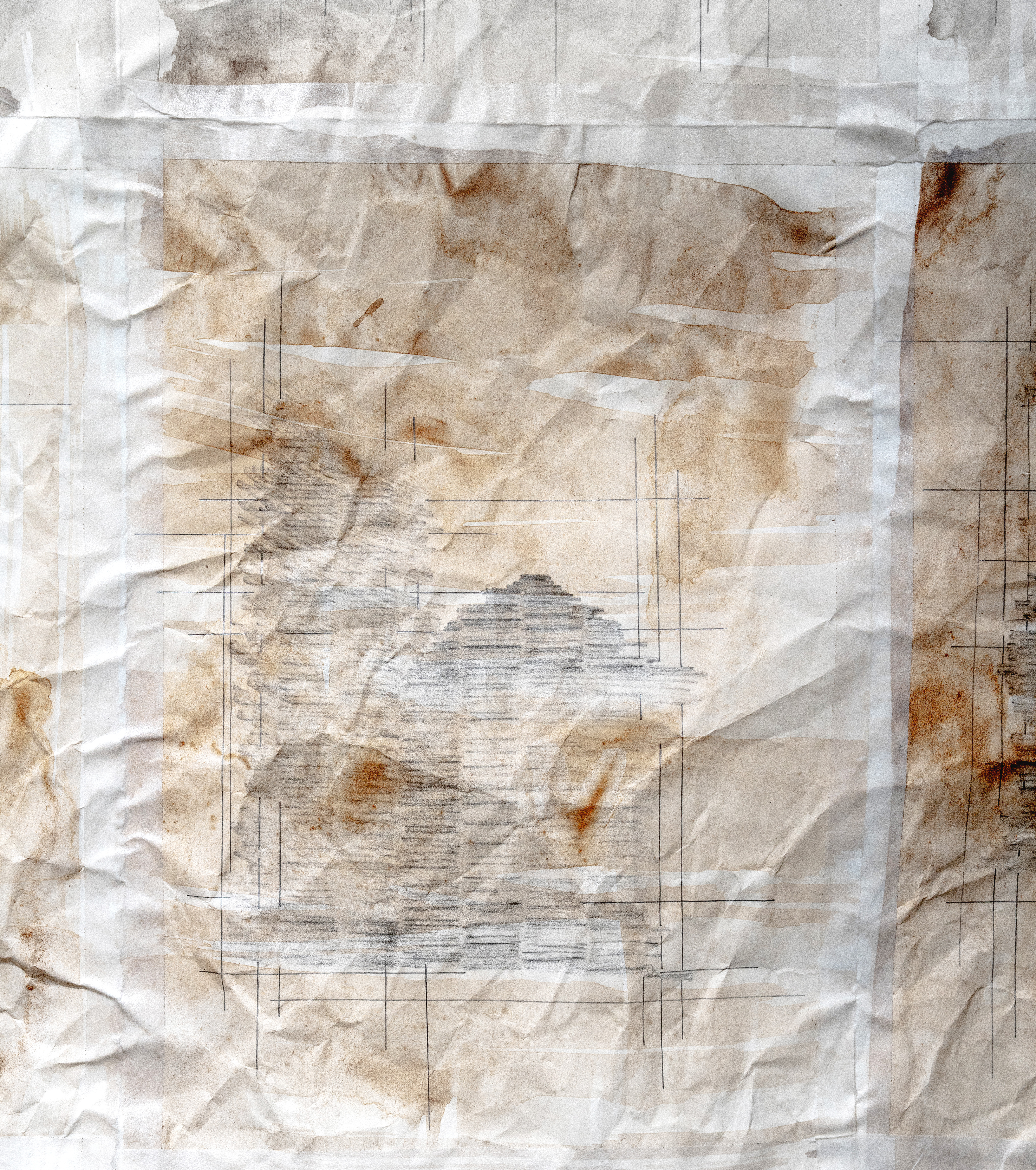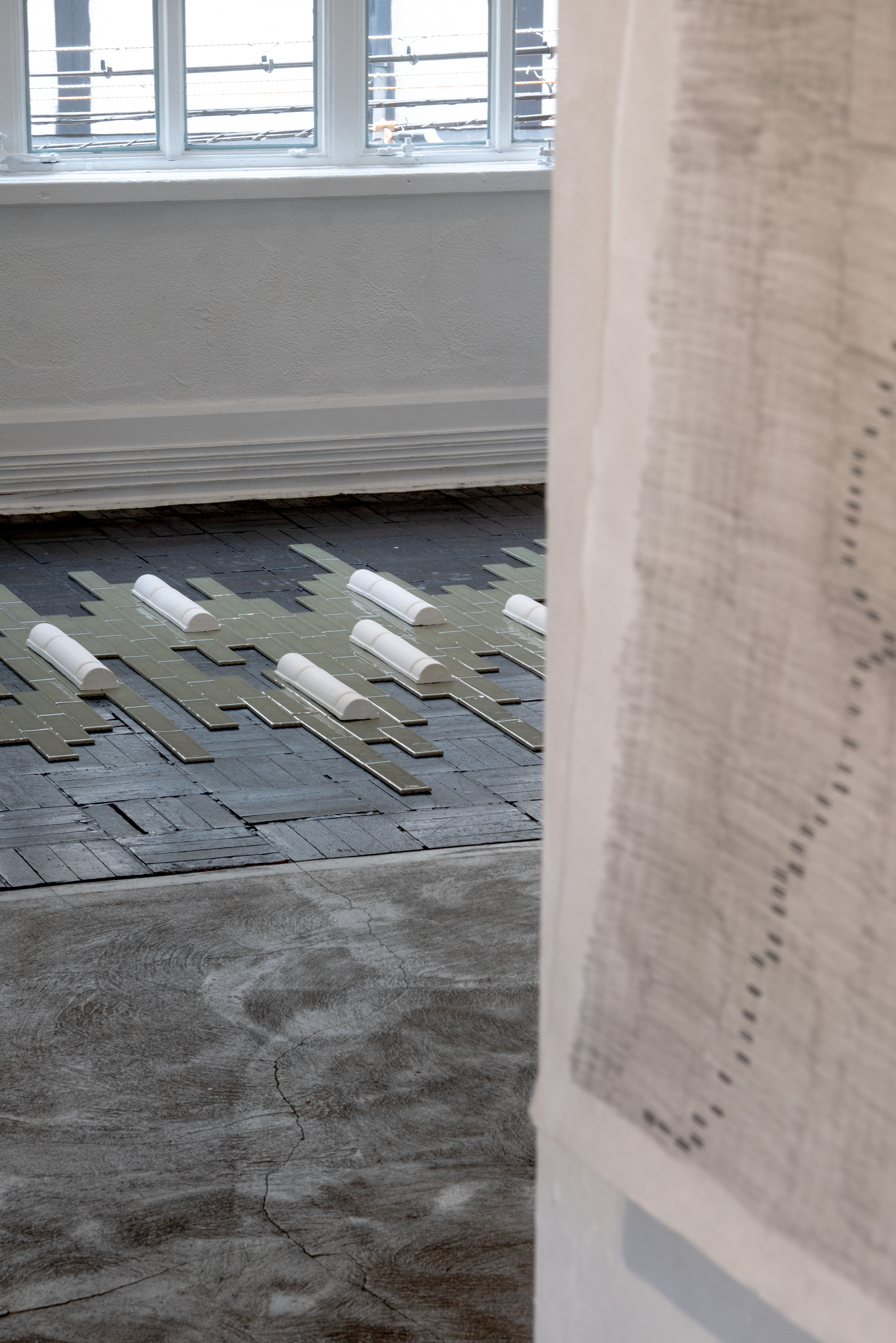 Some works echo architectural systems—tatami mats, tiled facades, walls patched with tape—structures designed to organise space, or to quietly absorb disruption. Others explore fragmentation more directly: cast bamboo pieces, torn sketchbook pages, or soft grids reassembled through provisional joins. In each, there's a sense of revision, of encountering the same material or form again—but differently.