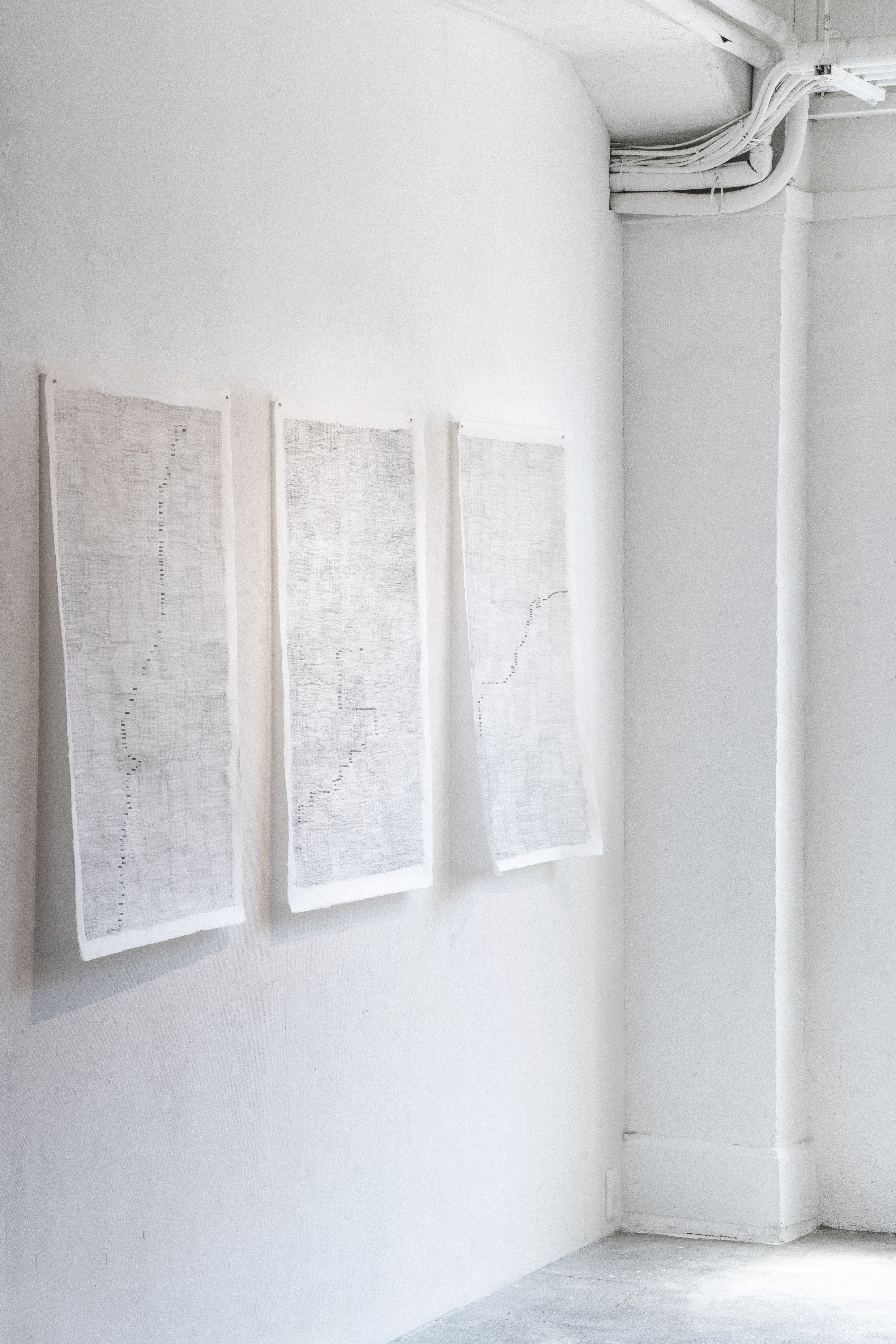 Many of the works begin with movement: walking routes through Kyoto’s grid, familiar buildings passed daily, bamboo collected from forests at the edge of the city. But what’s shown here is not that movement itself—it’s what remains after. These are surfaces that hold what was felt, pressed, interrupted. Still, not empty.